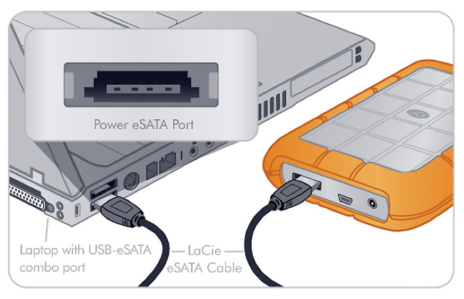 Die kombinierte USB-eSATA-Schnittstelle, auch bekannt als Power eSATA, hat einen anderen Anschluss als eSATA und ist meist an den neuesten Notebook-Modellen zu finden. Nach LaCie-Angaben ist Festplatte auch mit Standard-eSATA-Anschlüssen kompatibel.