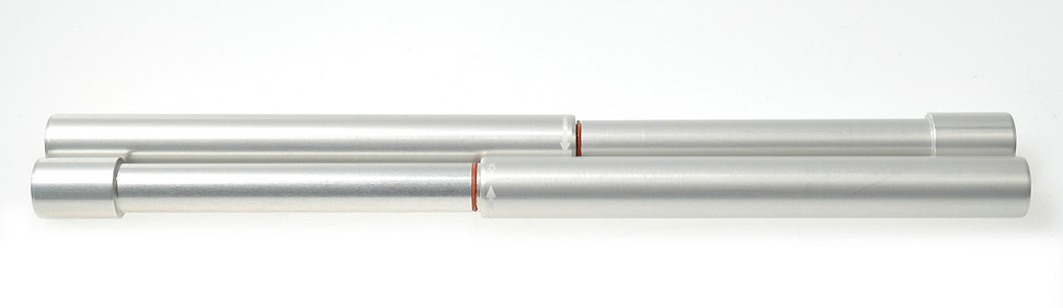 Mit kurzem Dreh in Richtung der aufgedruckten Pfeile soll sich die neue Länge fixieren lassen. Der Auszug ist nach Hersteller-Angaben aus Alu-Vollmaterial passgenau für das Außenrohr aus hochfestem Aluminiumrohr gefertigt, womit auch unter Last eine saubere Führung sowie ein leichtes Verstellen gewährleistet sein soll. Das Gewicht für ein Paar wird mit 141 Gramm angegeben.