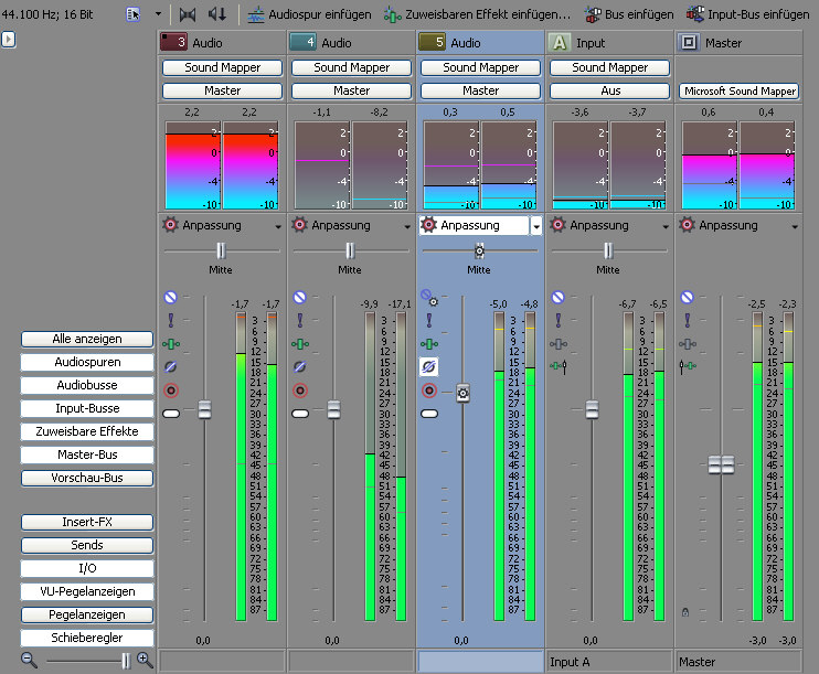 Die Stärken von Vegas Pro lagen schon immer im Audiobereich. Auch mit der neuen Version kommen wieder Verbesserungen in diesem Bereich hinzu. Bei der Mischkonsole können nun Eingangsbusse verwendet werden, die es erlauben, externe Signale, beispielsweise von einem Mikrofon, aber auch den Return von einem externen hardware-basierten Effektgerät anzuschließen. Um das so gemischte Signal als Datei aufzeichnen zu können, gibt es ab jetzt die Möglichkeit, das Audiosignal in Echtzeit zu rendern. So kann beispielsweise der gesprochene Kommentar gleich zum IT-Signal hinzugemischt werden.