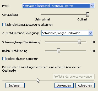 Das neue Feature »Medium stabilisieren« konnte durchaus überzeugen. Selbst stark verwackelte Einstellungen konnten damit gut und sehr zügig stabilisiert werden. Es geht so schnell, dass man getrost bei der Genauigkeit immer auf optimal stellen kann. Es gibt neun verschiedene Voreinstellungen, die für unterschiedlich stark bewegtes Material gedacht sind. Die vorhandenen Parameter Schwenk/Neige- und Roll-Stabilisierung können jedoch auch manuell nach eigenen Bedürfnissen justiert werden. Zusätzlich können auch noch Rolling-Shutter-Effekte korrigiert werden. Dass zur Korrektur das Video automatisch beschnitten wird und deshalb die Auflösung des neu errechneten Clips — je nach Amplitude der Bewegung — sehr in die Knie gehen kann, versteht sich von selbst. Trotz dieser Einschränkung ist diese Funktion interessant für alle, die kein Stativ verwenden können oder wollen, aber dennoch relativ stabiles Bildmaterial benötigen.