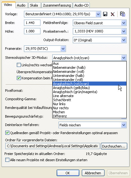 In jedem Falle muss in den Projekt-Eigenschaften zuerst der gewünschte Stereo-3D-Modus ausgewählt werden. Für diejenigen, die keinen 3D-Monitor besitzen, stehen drei Anaglyph-Modi (rot/cyan, blau/gelb oder grün/magenta) zur Verfügung. Wer also erst mal nur ein wenig experimentieren will, besorgt sich für wenig Geld eine entsprechende zweifarbige Brille — und schon kann es los gehen. Wer richtig in Stereo-3D einsteigen will, muss aber investieren: in einen 3D-Monitor und eine passende Grafik- oder Ausgabekarte.