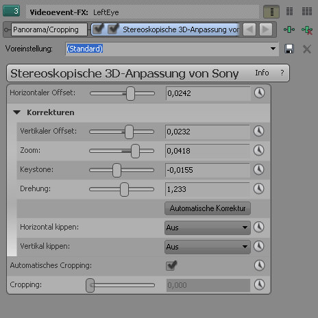 Material, bei dem beide Streams nicht ganz genau die gleiche Länge haben, muss vor der Bearbeitung synchronisiert und entsprechend getrimmt werden. Bei der Aufnahme von Szenen mit schnellen Bewegungen sollte darauf geachtet werden, dass die beiden Kameras per Genlock verkoppelt sind, damit sich durch den möglichen Versatz von bis zu einem halben Frame bei nicht verkoppelten Kameras, keine Probleme in der Verarbeitung entstehen. Wenn Stereo-3D-Material vorliegt, bei dessen Aufnahmen die Kameras nicht ganz korrekt justiert waren, kann dieses mit dem vorhandenen Plug-In »Stereoskopische 3D-Anpassung« in der Postproduktion korrigiert werden. Verschiedene Korrekturen, wie horizontale und vertikale Keystone-Verzerrung, können entweder manuell vorgenommen oder automatisch von Vegas Pro ausgeführt werden. Das Plug-In kann, wie alle Video-Plug-Ins auch, auf einzelne Events, Tracks oder den ganzen Film angewendet werden. Gerade für Unerfahrene ist diese Funktion sehr nützlich und hilft, ein brauchbares Ergebnis zu bekommen.