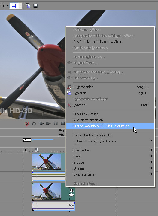 Für den Praxistest der Software stellte Sony einige Stereo-3D-Clips zur Verfügung. Grundsätzlich gibt es zwei Möglichkeiten, Stereo-3D-Material zu speichern und dieses dann zu bearbeiten: Entweder sind die beiden Streams für das linke und echte Auge getrennt und werden dann auf der Timeline zu einem Subclip zusammen gefügt, oder die beiden Streams sind in einem AVI- oder MOV-Wrapper oder einer CineForm Neo 3D Datei verbunden und können als ein Clip auf die Timeline gelegt werden. Vegas kann mit allen drei Formen umgehen. Zum Abspielen von Neo 3D wird jedoch ein Cine-Form Produkt oder der kostenlose Neo-Player benötigt. Bei den Beispiel-Clips des Praxistests handelte es sich um getrennte Streams.