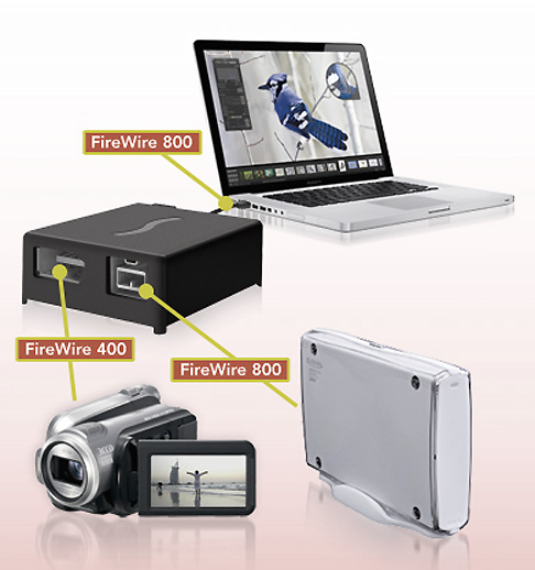 Mit dem Mini Hub von Sonnet können Mac-Besitzer an einem FireWire 800- Anschluss je ein FireWire 800- und ein FireWire 400-Gerät gleichzeitig einsetzen.
