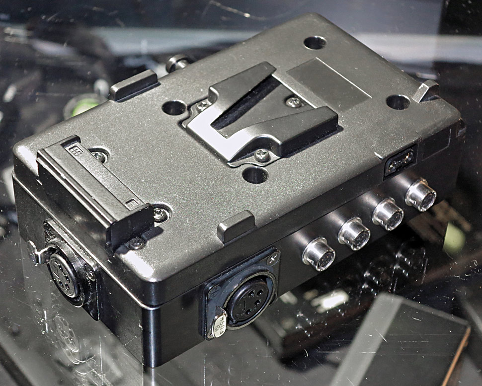 Die Breakout-Box wird anstelle der am Gerät vorhandenen V-Mount-Platte montiert. Sie bietet selbst wieder einen V-Mount-Anschluss und kann somit einen V-Mount-Akku aufnehmen. Den Strom aus dem Akku leitet die Box an das Hauptgerät weiter, mit dem sie verbunden ist, aber sie stellt auch über verschiedene Buchsen Spannung für Zubehör bereit. Die Box bietet verschiedene 14,8-V-Ausgänge und weist bis zu 10 A Gesamt-Ausgangsstrom auf. Es stehen zwei XLR-Ausgänge zur Verfügung, zudem noch vier Hirose HR10-7 Ausgänge mit 14,8 V, sowie ein D-Tap-Ausgang. Alle Kontakte sind vergoldet.