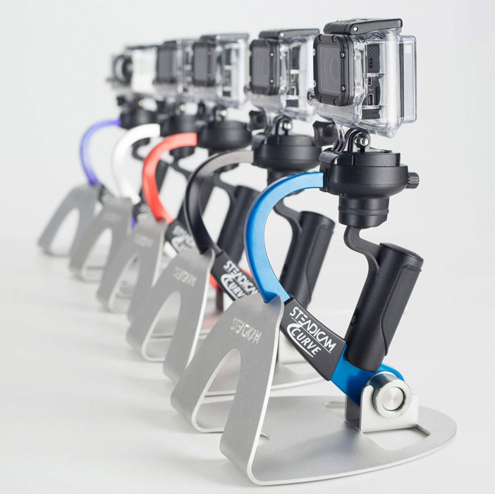 Steadicam Curve ist in 4 verschiedenen Farben verfügbar: Neben den Varianten mit blauem und rotem Alubügel wird es auch zwei Modelle in Schwarz und Silber geben.