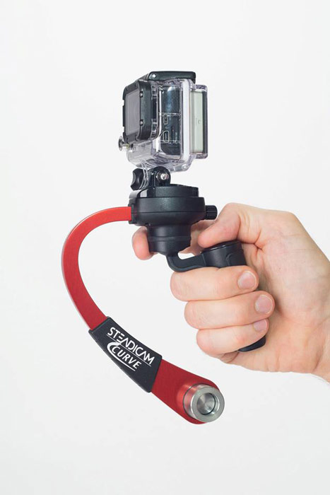 Steadicam Curve wird hierzu direkt unterhalb der GoPro-Kamera befestigt, über einen Handgriff kann die Kamera dann geführt werden. Die Stabilisierung der Kamera wird durch ein Gegengewicht erreicht, welches sich am Ende eines gebogenen Aluminium-Elements befindet: Da das Gegengewicht aufgrund seiner Trägheit unempfindlich gegen kurze Ruckler und Wackler ist, reagiert auch die damit verbundene Kamera weniger stark auf Erschütterungen und schnelle Bewegungen. Die Einheit aus Kamera und Gegengewicht ist auf einem Kugelkopf gelagert, der wiederrum mit dem Handgriff verbunden ist. Die Friktion zwischen Kugelkopf und Kamera mit Gegengewicht kann dabei frei eingestellt werden. Es ist auch möglich, den Handgriff ganz vom übrigen System zu lösen und ihn dann direkt an die GoPro-Cam zu schrauben.