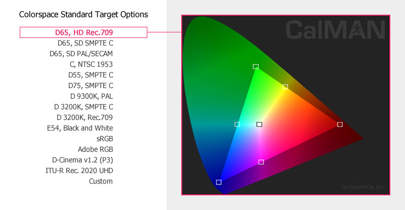 CalMan ColorChecker von SpectrCal überprüft, ob die Farbraum-Darstellung auf dem Monitor von einem zuvor ausgewählten Farbraum-Standard abweicht. Es stehen hier die in der Praxis gebräuchlichen Farbräume zur Verfügung, unter anderem auch Rec.709, PAL, sRGB oder Adobe RGB. Ist die Abweichung zum gewählten Farbraum-Standard gering, hat der Anwender die Gewissheit, dass der benutzte Monitor sämtliche Farb- und Helligkeitsinformationen korrekt darstellen kann.