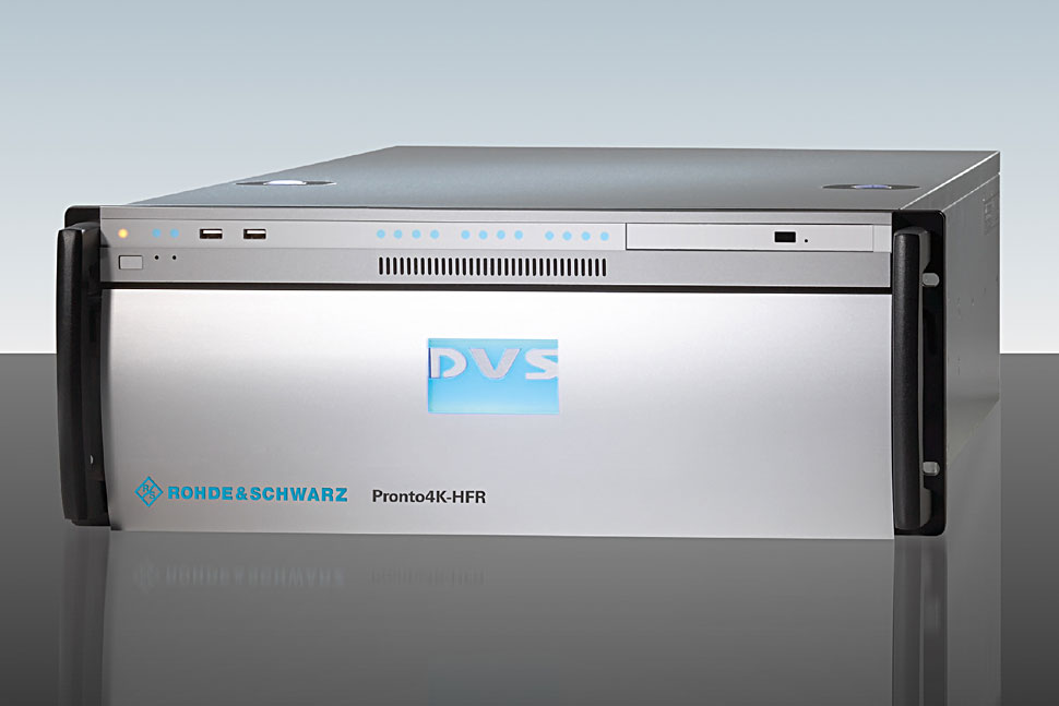 Mit Pronto4K-HFR launcht Rohde & Schwarz DVS einen Präsentationsplayer, der für hochwertige Videoprojektionen entwickelt wurde. Pronto4K-HFR spielt unkomprimiertes RGB 12 Bit-Material bis zu 4K in 60p aus, auch Material mit hohen Bildraten (HFR). Bis zum Jahresende sollen 120p für 10 Bit-Material möglich werden. Der 3D-fähige Player ist mit einem Hochleistungsspeicher, bestehend aus SSD-Platten, ausgestattet und ermöglicht dank eines Multi-Device-Features nahtlose Multi-Screen-Präsentationen, was besonders auf Messen, Konzerten, Großveranstaltungen oder in Freizeitparks von hohem Nutzen ist.