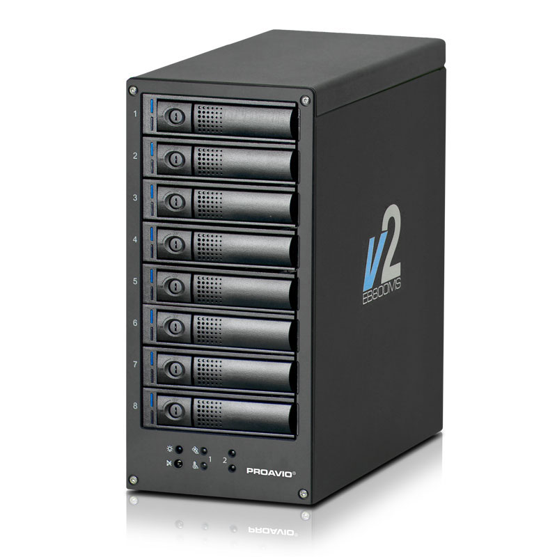Der Proavio EB800MS V2 ist mit Speicherkapazitäten von 8 TB bis maximal 32 TB erhältlich, die Festplatten finden in acht Laufwerksschächten Platz. Proavio bietet unterschiedliche Modellvarianten an, bei denen entweder Laufwerke mit SATA– oder SAS-Schnittstelle verwendet werden. Bei den aktuell verfügbaren Modellen setzt Proavio unabhängig von der Schnittstelle 3,5 Zoll-Laufwerke mit 7200 U/min ein. SAS-Laufwerke mit 10000 U/min und moderne 2.5 Zoll-SSDs mit 6 Gb/s oder 12 Gb/s Übertragungsrate sollen jedoch auch unterstützt werden.