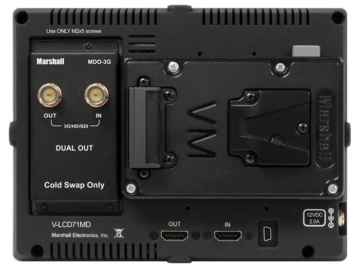 Der V-LCD71MD von Marshall ist in drei Anschlusskonfigurationen erhältlich: Die »Standardvariante« besitzt einen HDMI-Eingang sowie einen HDMI-Out, an dem das Eingangssignal wieder abgegriffen werden kann. Weiter bietet Marshall den Monitor auch unter der Bezeichnung V-LCD71MD-3G an. Dann besitzt er zusätzlich zu den HDMI-Buchsen auch noch einen Input und Output in HD-SDI. In der dritten Anschlussoption liefert Marshall den so genannten V-LCD71MD-O, der dann neben HDMI-I/O noch über zwei Ausgänge in HD-SDI verfügt, an denen das am HDMI-Eingang angelegte Videosignal ausgegeben werden kann.