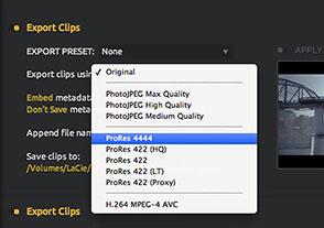Bullet Proof 1.2 besitzt ein Export-Modul, über das sich die zuvor importierten und ausgewählten Clips ausspielen lassen. Der Export kann im nativen Aufnahmeformat erfolgen. Auf Wunsch lässt sich das Material bei der Ausgabe aber auch in ein anderes Videoformat transcodieren. Zur Wahl steht hier beispielsweise ProRes, H.264, AVC-Intra oder auch Photo-JPEG oder Motion-JPEG.