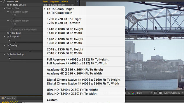 Weiter findet sich im Software-Bundle Instant 4K, die Nachfolgeversion von Instant HD. Wie der Name schon vermuten lässt, dient dieses Tool dem Hochskalieren von Footage. Die Qualität der Skalierung soll dabei wesentlich besser sein, als sie von den in einer NLE-Anwendung integrierten Upscalern bekannt ist. Über vorinstallierte Presets kann das Material recht einfach auf Raster wie 720p, 1080p, 2K oder auch 4K »aufgeblasen« werden. Instant 4K funktioniert als Plug-In für Adobe After Effects und Premiere Pro ab Version CS5.