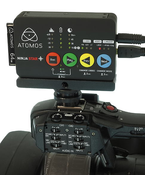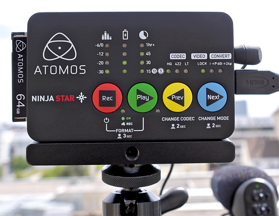 Zusätzlich zu HDMI bietet Hyperdeck Shuttle 2 auch noch einen SDI-Ein- und Ausgang. Ein Blick auf dieses Gerät lohnt sich auch für Atomos-Interessenten, aber in puncto Kompaktheit und niedrigem Gewicht hat der Ninja Star definitiv die Nase vorn.