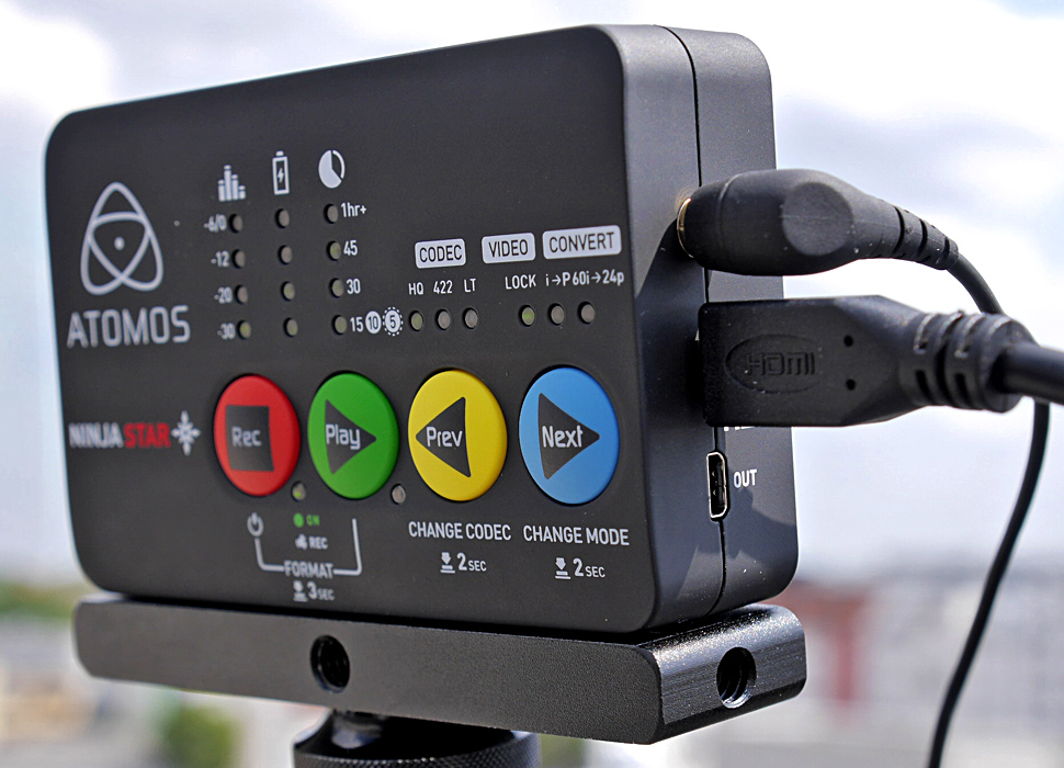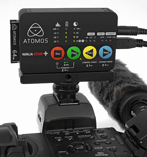 Die Bedienung des 130 g leichten Recorders erfolgt ausschließlich über die vier großen Tasten im bekannten Atomos-Look. Wegen seiner geringen Baugröße und des niedrigen Gewichts eignet sich der Ninja Star besonders gut, um ihn mit kleinen kompakten Kameras zu kombinieren und ihn etwa auch im Zusammenspiel mit Multikoptern oder anderen Drohnen einzusetzen.