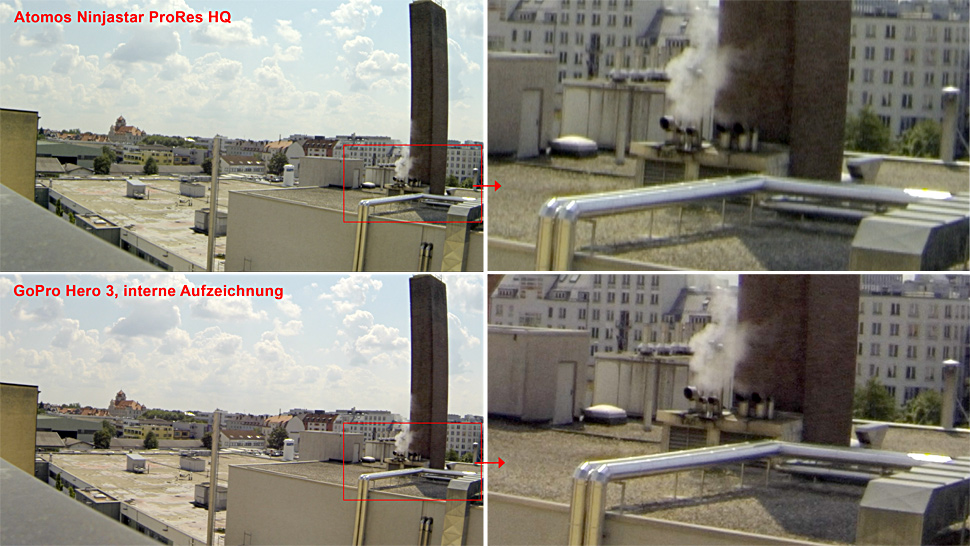 Bei all diesen Testaufnahmen war kaum ein sichtbarer Unterschied zwischen den internen Aufnahmen der Hero 3 und den externen Aufnahmen des Ninja Star auszumachen. Die Aufnahmen der Hero 3 hatten einen leichten Magenta-Stich, während die Aufnahmen des Ninjastar einen schwachen Grünstich zeigten. Oft wirkte das GoPro-Video sogar minimal schärfer als das Ninja-Star-Material. Weder bei Verläufen, noch bei farbigen Kanten war ein qualitativer Unterschied zu sehen, auch nicht bei exzessiver Farb- und Kontrastbearbeitung. Da liegt die Vermutung nahe, dass die GoPro gar kein höherwertiges Signal ausgibt, als sie intern aufzeichnet. In diesem Fall bringt die Kombination einer GoPro mit einem externen Recorder generell keinen Vorteil, gleichgültig, ob es sich um den Ninja Star oder ein anderes Gerät handelt.