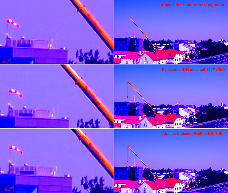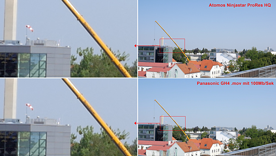 Der Unterschied wird — wie zu erwarten — geringer, wenn man die GH4 so einstellt, dass sie nur noch ein 8-Bit/4:2:2-Signal ausgibt, bei dem man dann auch in der GH4 gleichzeitig aufnehmen kann.