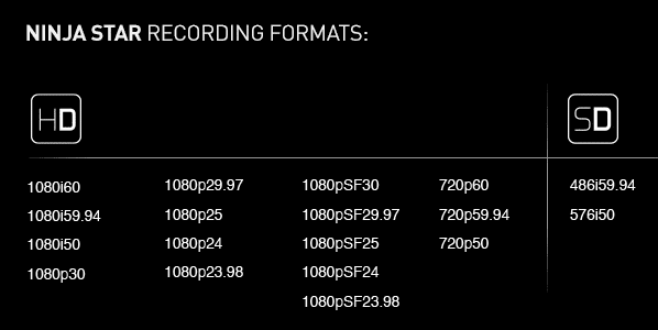 Für die Aufzeichnung nutzt der Ninja Star den weit verbreiteten ProRes-Codec in den Varianten HQ, 422 und LT. Dabei beherrscht der Recorder Videobildraten von 24p, 25p, 30p, 50i und 60i. Das Gerät ist nicht dafür ausgerüstet, Signalwandlungen durchzuführen, außer von 60i auf 24p.