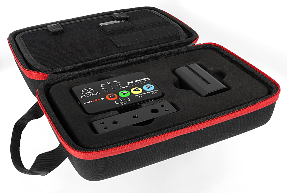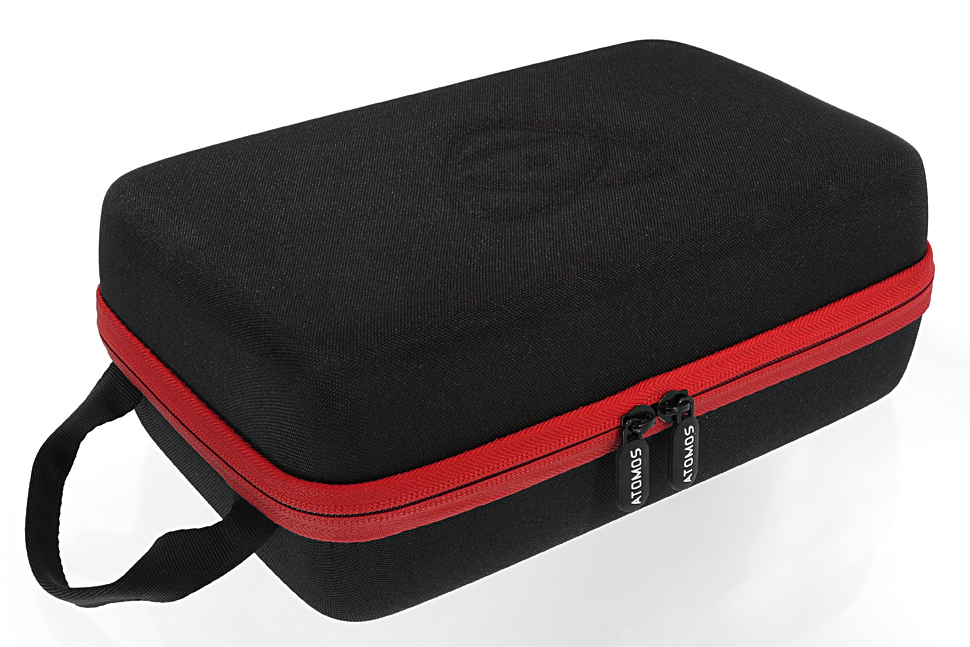 Bis auf die CFast-Karte befindet sich das Zubehör im Lieferumfang (Recorder, sony-kompatibler Akku, Ladegerät mit Netzgerät und Autoadapter, Mini-Cheeseplate). Das Gerät selbst und das mitgelieferte Zubehör erhält der Kunde von Atomos  in einem stabilen Softcase.