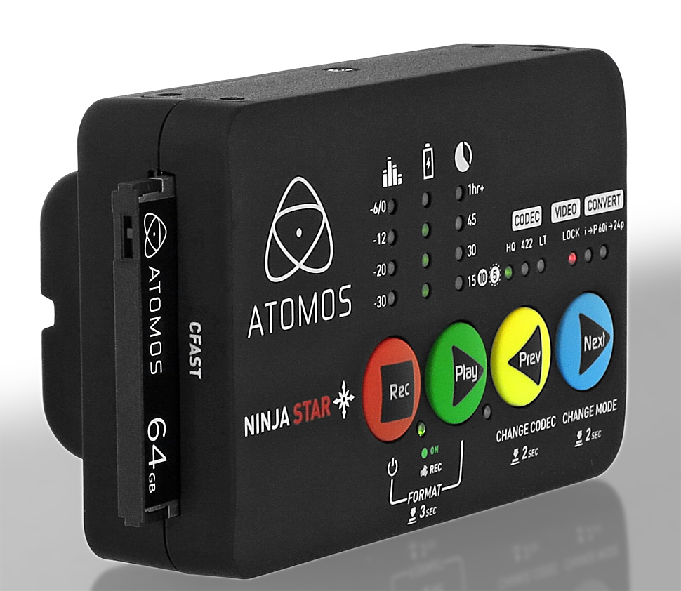 Der Ninja Star besitzt kein Display, er zeichnet intern mit 10-Bit-Quantisierung und 4:2:2-Farb-Sampling im ProRes-Codec auf eine CFast-Karte auf. Dabei sei gleich angemerkt, dass es sich dabei nicht um die relativ teuren CFast-2.0-Karten handeln muss, sondern dass die wesentlich günstigeren CFast-1.0-Karten zum Einsatz kommen, die Atomos auch passend zum Gerät anbietet. Raw-Daten kann der Ninja Star nicht aufzeichnen, er schreibt immer ProRes-Daten auf die Karte.