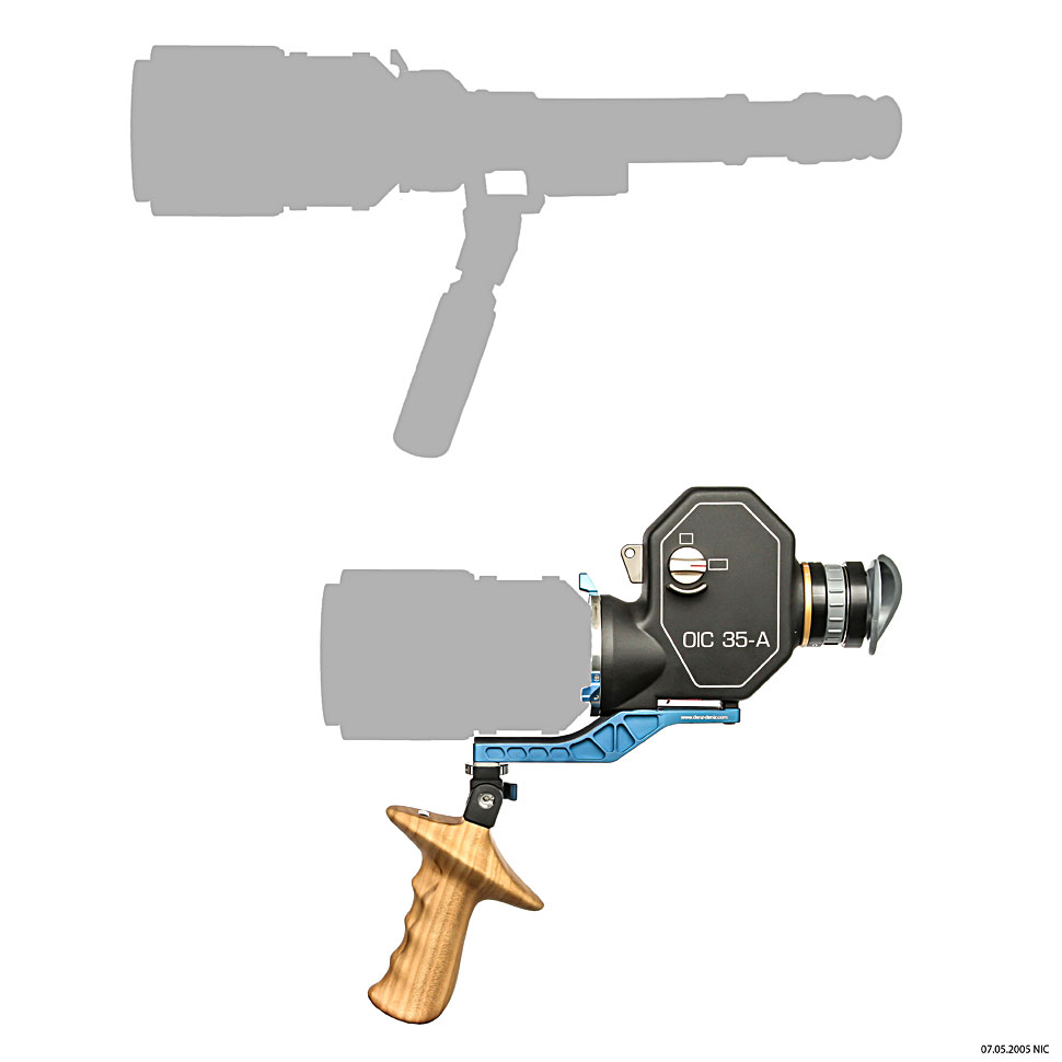 Unter dem Denz OIC 35-A ist eine Trägerplatte mit drei festen Positionen zur Montage des Handgriffs montiert. So kann man immer schnell den richtigen Schwerpunkt zum angesetzten Objektiv finden. Während der Motivsuche muss das Gerät mobil sein, denn das Suchen des richtigen Standpunktes ist immer mit Bewegung verbunden. Durch den ergonomischen Holzhandgriff mit einer neuen angenehmen Softbeschichtung liegt das Gerät mit einem Eigengewicht von 1.200 Gramm auch noch mit eingesetztem Objektiv sicher in der Hand. Den Winkel des Handgriffs zum Gerät kann man individuell einstellen und damit die Klemmung im Kippgelenk auch wirklich hält, ist eine Hirth-Verzahnung eingebaut, die über einen Klemmhebel aktiviert wird und dann nicht mehr nachgibt, so der Hersteller.