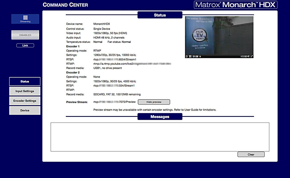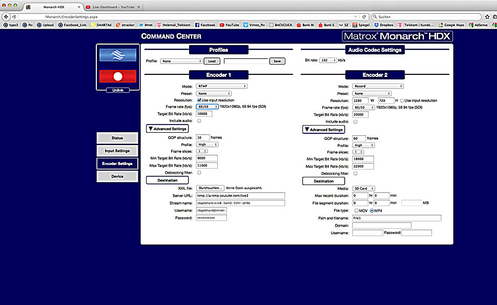 Beim Thema Streaming testete film-tv-video.de die Ausgabe auf Youtube. Das Setup hierfür ist vergleichsweise leicht einzurichten, weil man lediglich die Youtube-Server-URL und den Stream-Namen aus Youtube ins Setup-Menü des Encoders kopiert.