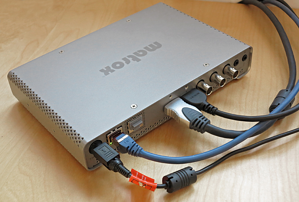 Monarch HDX ist sehr kompakt und wiegt auch nur rund 600 g. Einerseits bietet die Box I/Os für HDMI und SDI. Zusätzlich sind eine Aux-BNC-Buchse, Audio-Klinken-I/Os sowie eine RS232- und eine LAN-Buchse eingebaut. Für die Stromversorgung steht eine vierpolige Buchse zur Verfügung. Auf einen Ein-/Ausschalter des Geräts hat Matrox leider verzichtet, was schade ist.