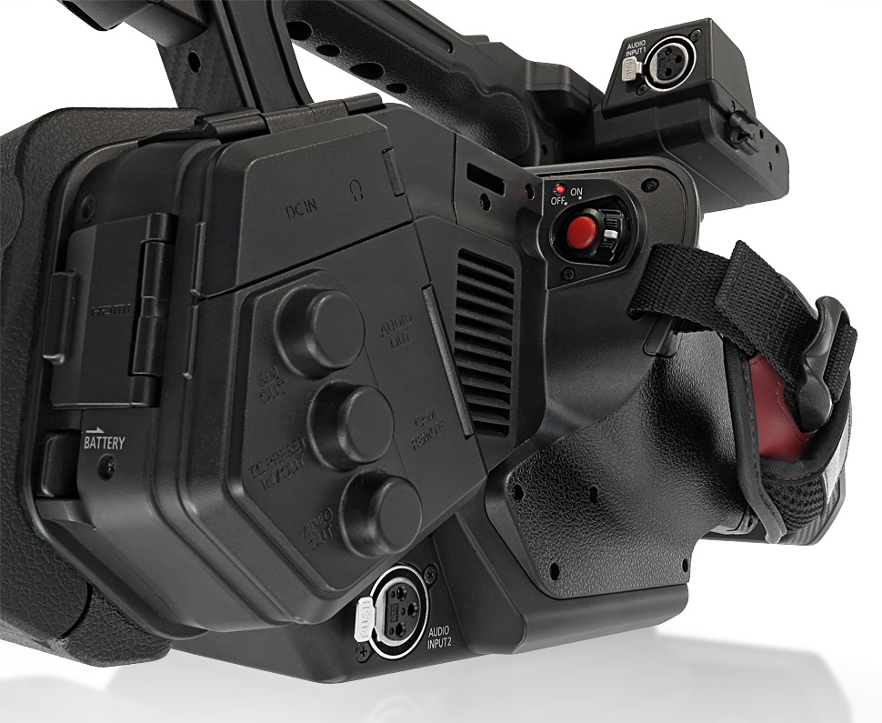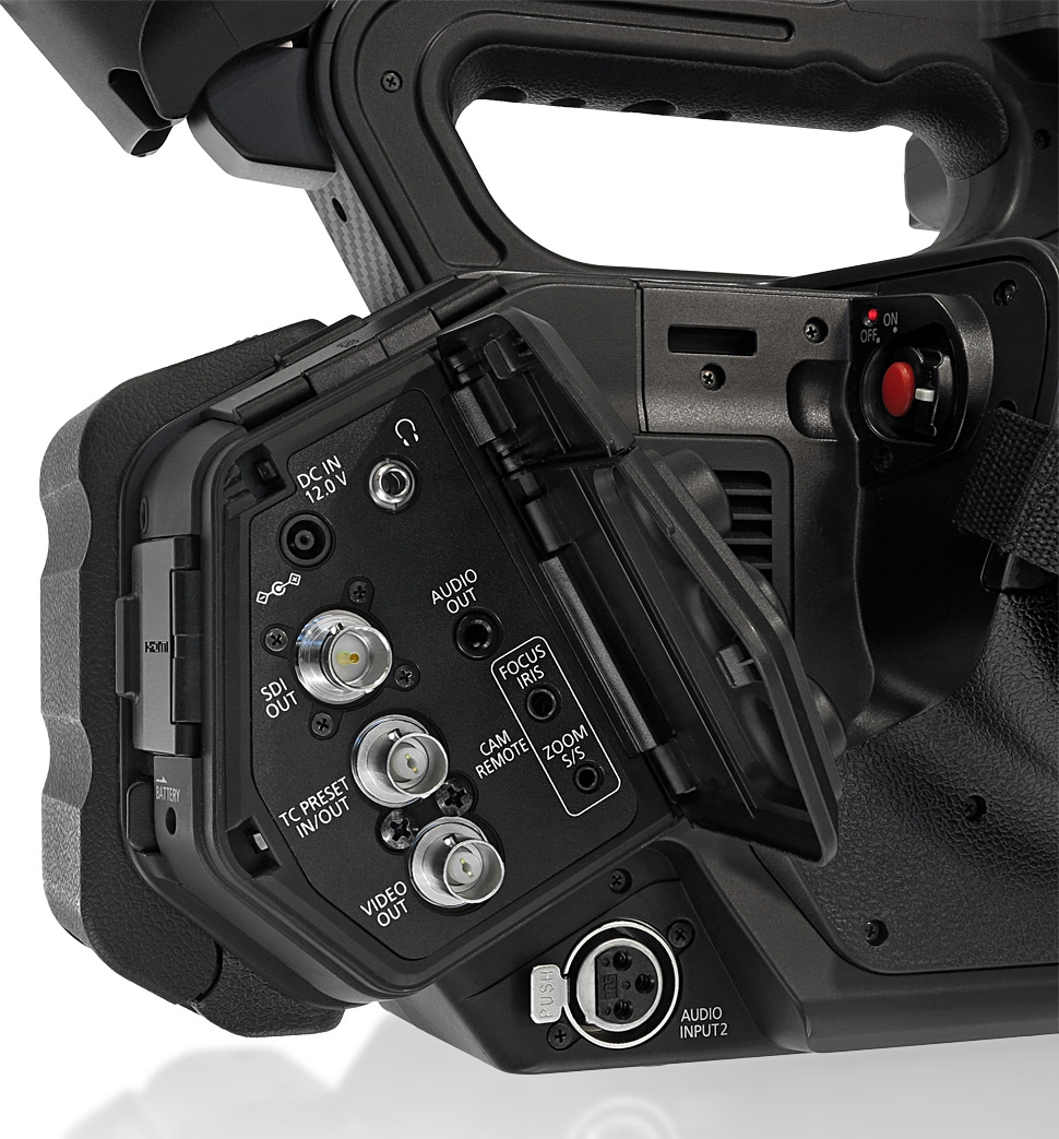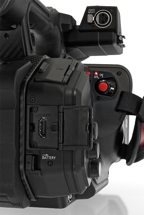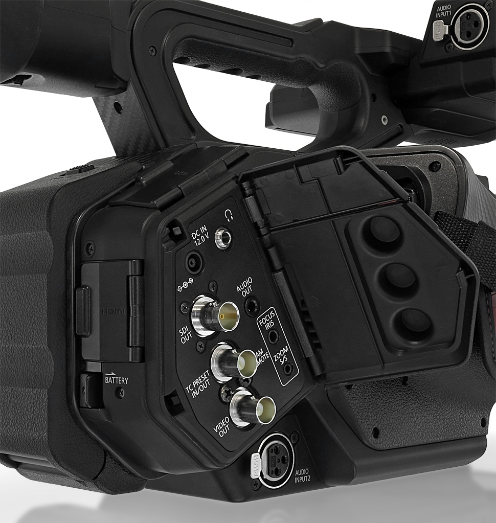 Das Gehäuse wirkt insgesamt stabil, auch wenn es vielleicht eine etwas zu plastikhafte Anmutung hat. Am wenigsten gelungen sind die Abdeckungen der SDI-Schnittstelle, der Tonbuchsen oder des Kopfhörerausgangs: Sie hinterlassen den Eindruck, sich bei der ersten Gelegenheit verabschieden zu wollen. Verwendet man einen Kopfhörer oder schließt etwa einen externen Recorder oder Field-Monitor an und hat hierfür die Klappe des SDI-Ausgangs geöffnet, dann stören die jeweiligen Abdeckklappen bei der Bedienung des Camcorders.