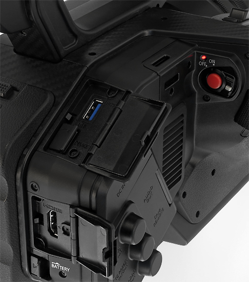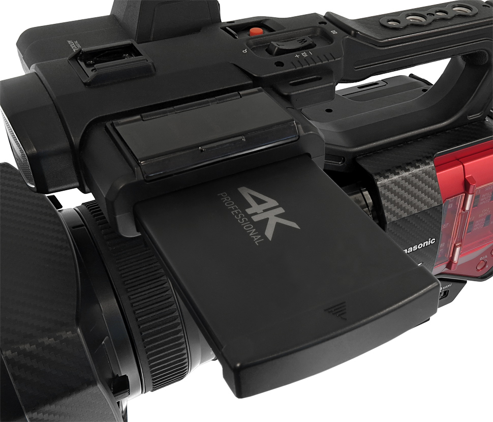 Voraussetzung für das Aufzeichnen mit hohen Frame- und Datenraten sind SD-Speicherkarten der UHS Speed Class 3. Es stehen zwei Slots für SD-Speicherkarten zur Verfügung. Parallel zu einer UHD-Aufnahme lässt sich beispielsweise auch gleichzeitig eine Proxy-Datei mit 8 Mbps auf der zweiten Karte aufzeichnen.