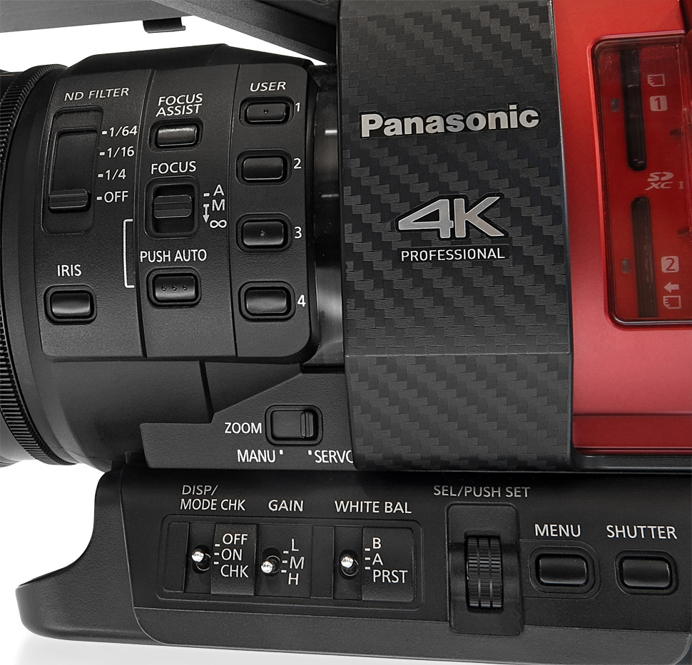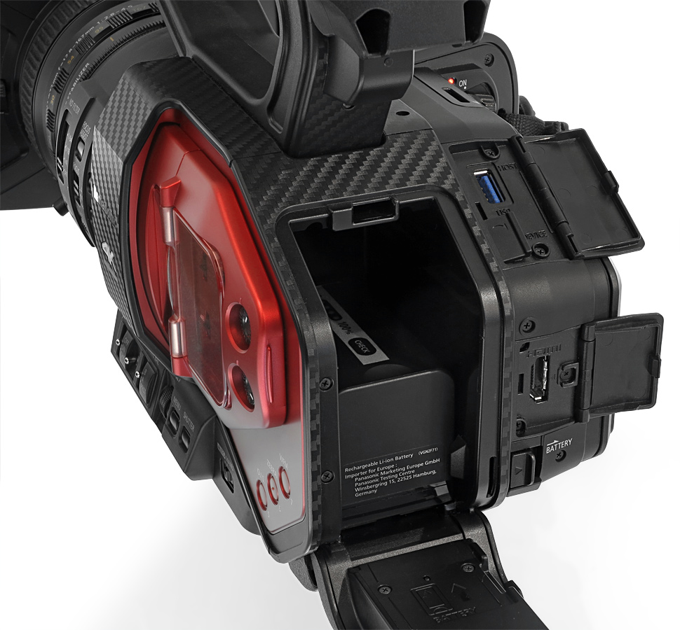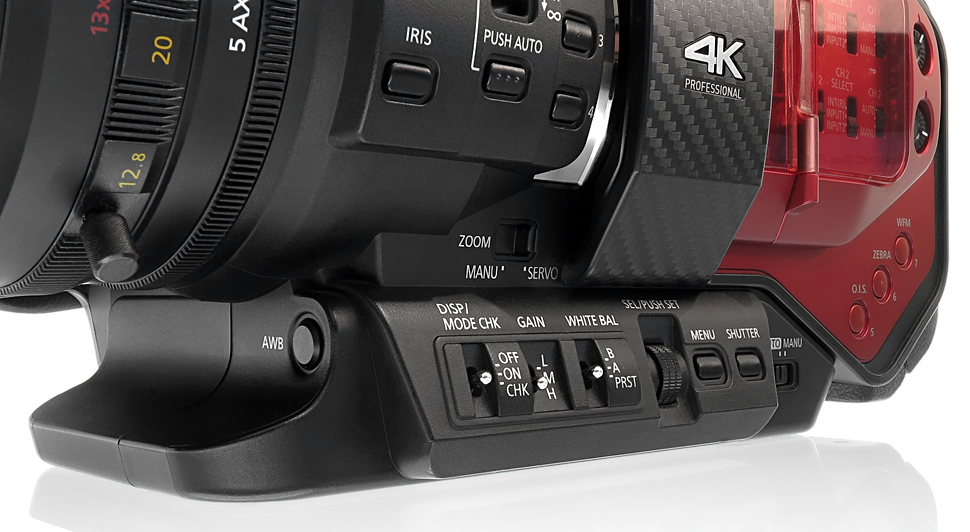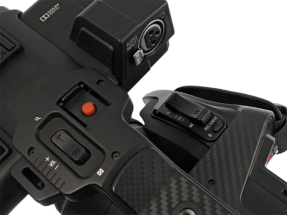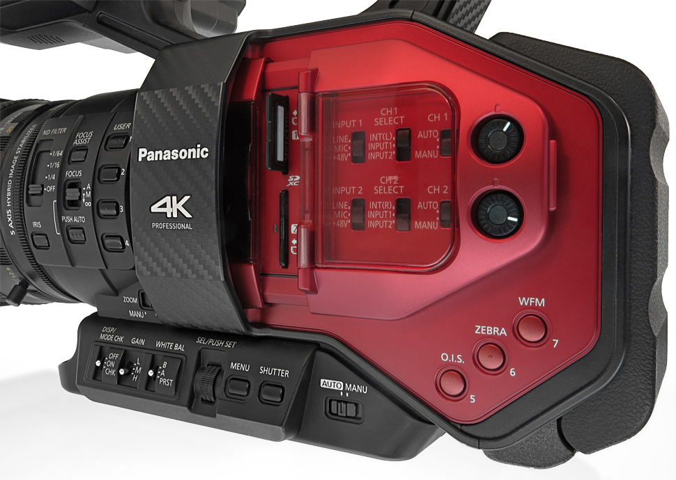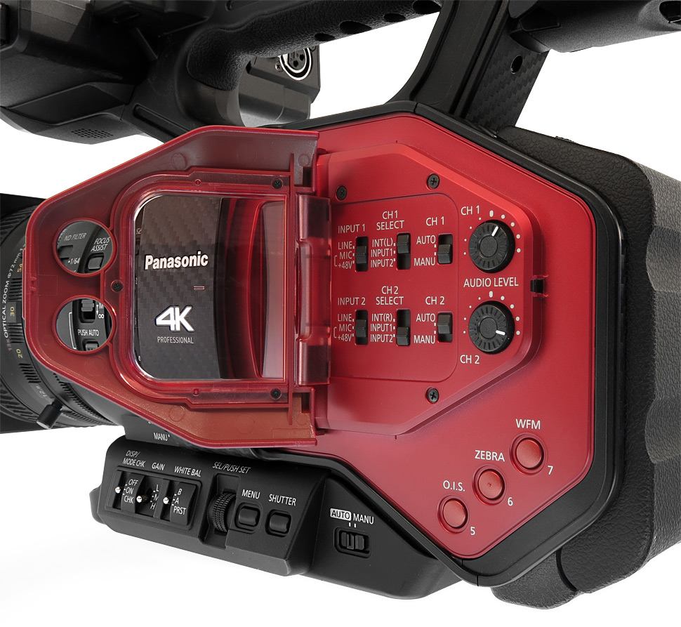 Die Bedienelemente sitzen genau da wo man sie vermutet — zumindest wenn man Panasonic-Handhelds kennt und schon benutzt hat. Für Blende, Schärfe und Zoom bietet das Objektiv jeweils einen eigenen Bedienring. Die wichtigsten Tasten für Weißabgleich, Gain und Shutter befinden sich gut zugänglich für die linke Hand vorne am Gehäuse. Alle Ton-Bedienelemente sind unter einer Klappe in der roten Abdeckung versenkt, auch die Wahl des Eingangs findet hier statt.