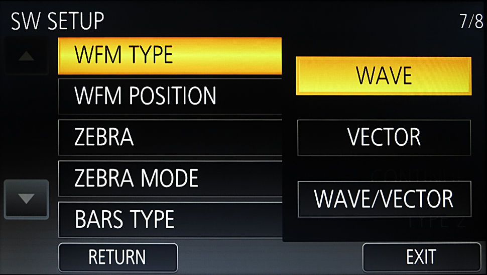Mit der Waveform-Taste kann auf Wunsch eine Waveform oder ein Vektorskop-Darstellung eingeblendet werden. Die Darstellung auf dem Display, im Sucher und im ausgegebenen Bildsignal lässt sich umfangreich einstellen.