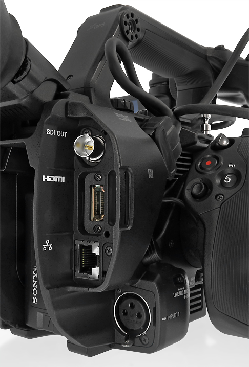 Nützlich ist auch, dass eine XLR-Buchse direkt im Kamerabody eingebaut ist, denn so lassen sich XLR-Mikrofone auch dann nutzen, wenn der Audiohenkel abgenommen wird. Mit HDMI– und HD-SDI-Out sowie Ethernet- und WiFi-Funktion ist der FS5 zudem auch Anschlussseitig gut gerüstet.