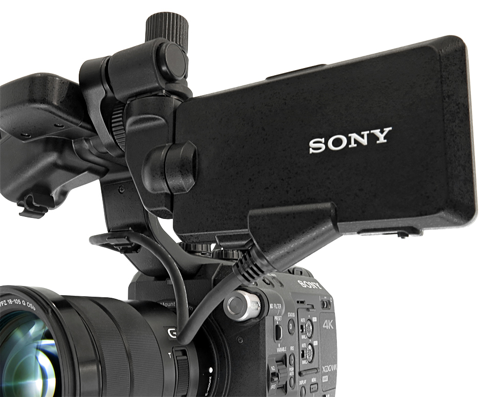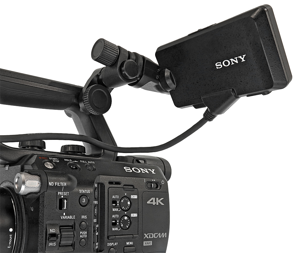 Dass Sony dem FS5 eine neu entwickelte, sehr gelungene Display-Halterung spendiert hat, kann man fast nicht genug loben. Damit kann der LCD-Schirm sehr schnell in die gewünschte Position gebracht werden, um einen optimalen Blick darauf zu haben — wenn es sein muss auch mit einer Hand. Hier hatte Sony beim FS7 noch gepatzt und eine eher zweifelhafte Lösung angeboten. Beim FS5 hingegen ist eine praktische, wertige Lösung geglückt, die es etwa auch erlaubt, das Display sehr schnell komplett vom Camcorder zu entfernen, wenn das notwendig ist. Bei Bedarf lässt sich der FS5 komplett ohne Display und nur mit dem integrierten Sucher betreiben.
