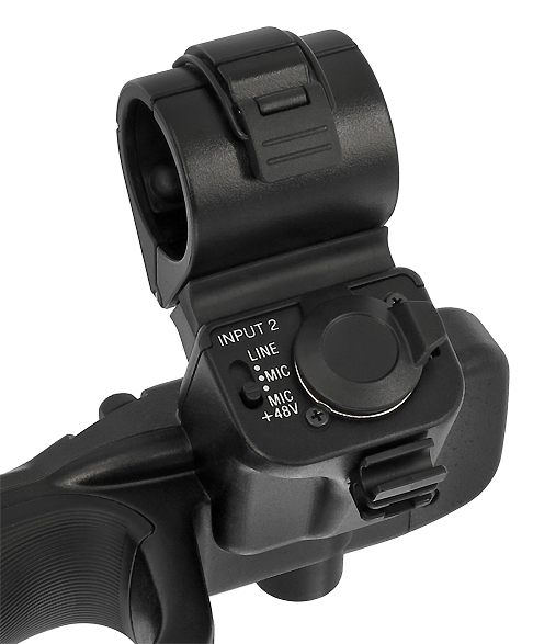 Positiv fiel auch die im Henkel integrierte Steckverbindung auf, über die der Camcorder den elektrischen Kontakt zum im Henkel eingebauten Mikrofon, XLR-Anschluss und den hier verorteten Audiobedienelementen herstellt.