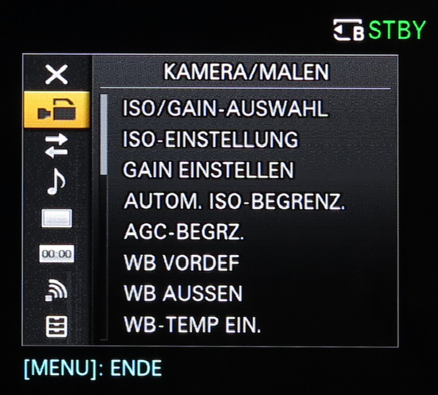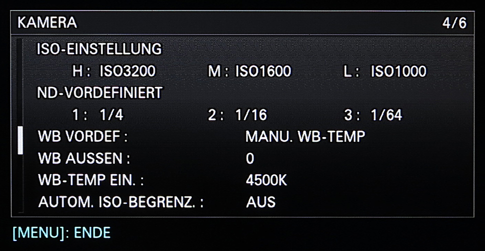 Für einige ausgewählte Funktionen gibt es auch eine alternative Bedienmöglichkeit, sozusagen einen Mittelweg zwischen separatem Bedienelement und allgemeinem Einstellmenü — oder eine Menüabkürzung: Über die Taste »Direkt-Menü« lassen sich Blende, ISO, Shutter, Weißabgleich und ND-Filter sehr schnell anpassen. Aufgerufen wird das »Direkt-Menü« über einen Assign-Button. Ab Werk ist dies der Button am Handgriff. Die jeweiligen Parameter lassen sich dann über das Steuerkreuz anpassen.
