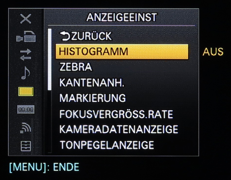 Zum einen bietet der Camcorder die klassischen Standard-Fokus- und Belichtungs-Tools wie Peaking und Zebra. Weiter ist als Hilfe bei der manuellen Belichtungseinstellung neben der Zebra-Funktion auch noch eine Histogramm-Darstellung verfügbar. Wenn es dann noch Klärungsbedarf beim Einstellen der Schärfe gibt, lässt sich ein Focus Magnifier aufrufen, mit dem eine bis zu 8-fache Ausschnittsvergrößerung möglich ist.