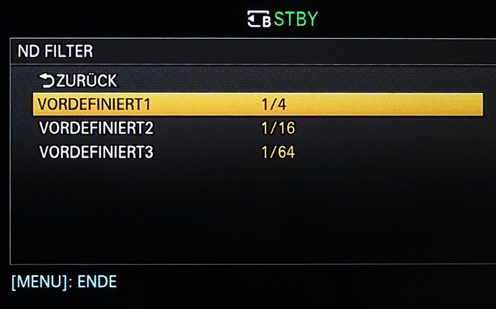 Der Wert für den ND-Filter lässt sich per Drehrad an der linken Camcorderseite einstellen, wobei dieses Drehrad eine sehr angenehme Dämpfung aufweist und insgesamt einen wertigen Eindruck hinterlässt. Der jeweils aktuelle ND-Wert kann im Display eingeblendet werden.