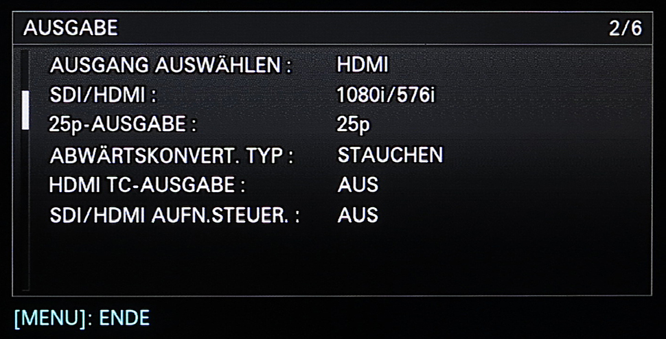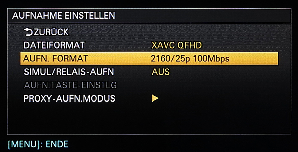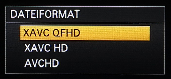 Will man in QFHD-Auflösung (3.840 x 2.160) aufzeichnen, steht hierfür ebenfalls der XAVC-Codec zur Verfügung. Im 50-Hz-Betrieb ist das Aufnahmeraster dabei stets auf 2160p25 gesetzt, es kann jedoch zwischen der hohen Datenrate mit 100 Mbit/s oder einer niedrigeren mit 60 Mbit/s gewählt werden. Die Farbverarbeitung bei XAVC QFHD liegt bei 4:2:0 mit 8 Bit.