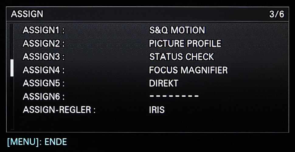 Wer die Camcorder-Bedienung etwas individueller an die eigenen Bedürfnisse anpassen möchte, dem eröffnen sechs Assign-Tasten die Möglichkeit hierzu. Sie lassen sich per Menü mit Funktionen belegen, rund 30 Menüpunkte stehen hierfür zur Auswahl, vom Focus Magnifier über Peaking, Farbbalken, Steadyshot, bis hin zu Smartphone Connect und Streaming. Drei Assigns-Buttons finden sich direkt am Body, drei weitere im ergonomischen Handgriff.