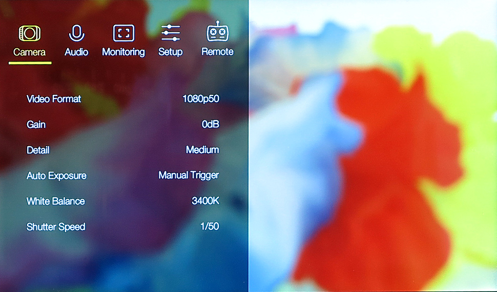Sämtliche Parameter wie Weißabgleich, Lichtempfindlichkeit (angegeben in Gain-Werten), Shutter und alle Audio-Parameter lassen sich per Menü einstellen. Für sehr schnelles, flexibles Reagieren auf veränderte Drehbedingung direkt an der Kamera, ist diese Bedienweise nicht optimal, die Mini Studio Camera ist eben, wie schon erwähnt, nicht für Run-and-Gun-Einsätze konzipiert, sondern als Live-Studio-Kamera, die man eher fernbedient und auch nicht während des laufenden Betriebs permanent umstellt.