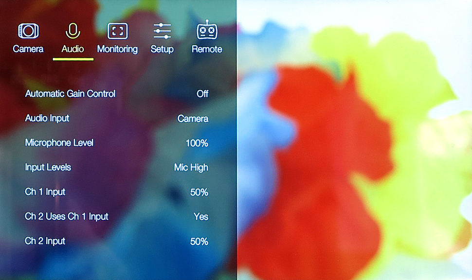 Die HDMI-Overlays lassen sich nur komplett ausstellen, so dass man ohne die Overlays beispielsweise nicht sehen kann, welche Blende man gerade verwendet. Der Ton kann über eine Automatik oder manuell, gut differenziert von 0 bis 100 % eingestellt werden. Einen Limiter besitzt die Kamera nicht. Der Kopfhörerausgang lässt sich im Menü regeln und kann auch relativ laut eingestellt werden, so dass man den Ton mit einem guten Kopfhörer auch in lauteren Umgebungen zuverlässig mithören kann.