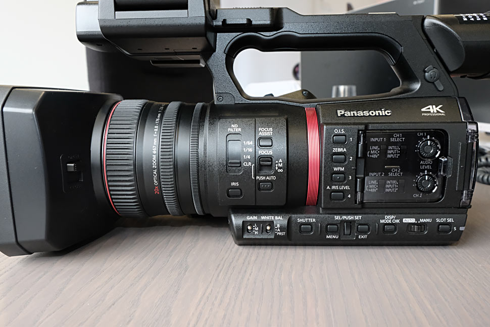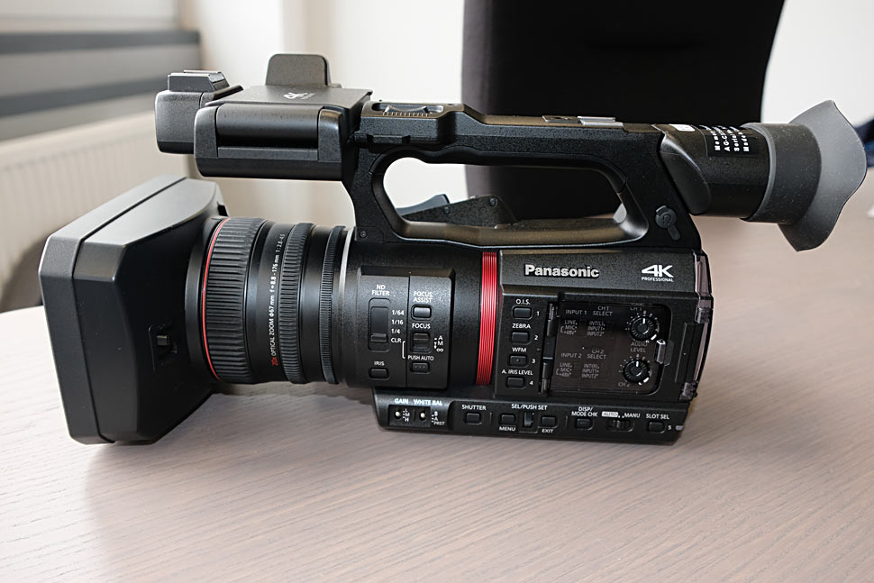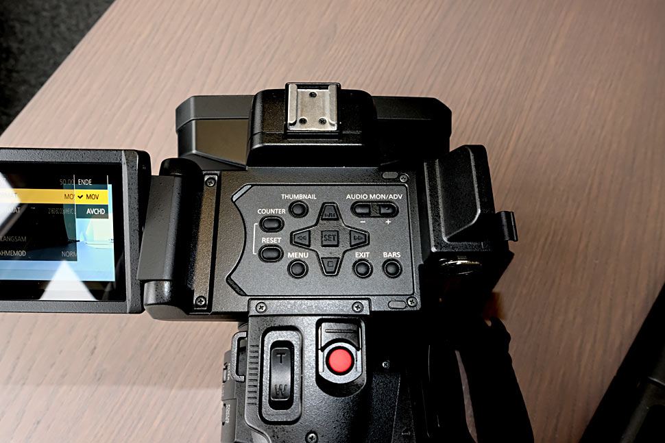 Panasonic hebt das große Weitwinkel-Objektiv des neuen Camcorders hervor. Mit 24,5 mm sollen Bilder mit minimaler Verzerrung möglich sein, und das eben ohne den Einsatz eines Konverters. Der 20-fach optische Zoom deckt in allen Betriebsarten einen Bereich bis 490 mm ab.