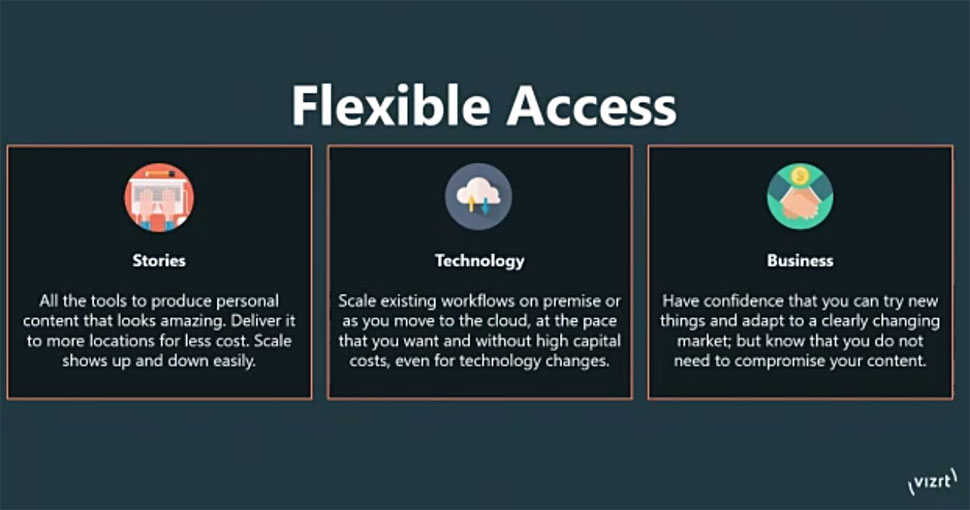 Mit Flexible Access bietet der Hersteller fünf neue Lösungen, die auf monatlicher Basis abgerechnet werden. Auf diese Weise könne der Kunde die Software-Tools für die jeweilige Content-Produktion anpassen und nach oben und unten skalieren, um schnell wechselnden Produktionsanforderungen gerecht zu werden, betont Vizrt. Kapitalintensive Vorabinvestitionen würden obsolet, so der Hersteller, und es werde möglich, Ergebnisse schneller zu realisieren.