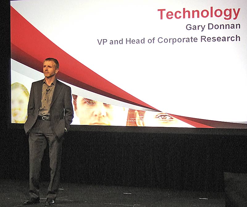 Mit Gary Donnan betrat bei Thomson ein Mann aus der Entwicklungsabteilung die Bühne. Er gab einen kurzen Überblick aktueller Technologien, die zwar noch keine Produktreife erreicht haben, die Thomson aber während der NAB2008 als Blick in die Zukunft zeigen will. Funktionen um automatisiert vorhandenes Bildmaterial für kleine Displays optimieren zu können sind AVC-Transcoding mit Reframing-Technologie sowie Object-Highlighting. Beides soll vereinfacht gesagt dazu beitragen, dass man bei Fußballspielen auf dem Handy-Display auch den Ball sehen kann. Außerdem stellt Thomson einen AVC-Professional-Decoder vor und ein System mit dem sich AV-Material in Echtzeit über 10-Gbps-Ethernet übertragen lassen soll. Ebenfalls als Technologie-Demo bei Thomson zu sehen: WAN-Echtzeit-Streaming von 2K/4K-Daten über lange Distanzen.