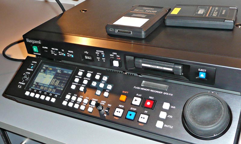 Was bei Sony die SxS– und bei Panasonic die P2-Karten sind, das sind bei Ikegami die GF-Paks. Diese Medien hat Ikegami gemeinsam mit seinem Anteilseigner und Partner Toshiba entwickelt, so wie das ganze GF-System eine Gemeinschaftsentwicklung dieser beiden Unternehmen ist. Die GF-Paks sind etwas kleiner als die bisher von Ikegami in der Editcam genutzten Field-Pak-Wechselfestplatten, aber deutlich größer als SxS, P2, SD– oder CF-Speicherkarten. Sie bieten allerdings auch eine integrierte Kapazitätsanzeige und sind mit zwei Schnittstellen ausgestattet, die im IT-Bereich weit verbreitet sind: SATA und USB 2.0 — man benötigt also nicht unbedingt einen Reader oder einen Rechner mit speziellen Slots, um das Material von GF-Paks kopieren, sichten und schneiden zu können.