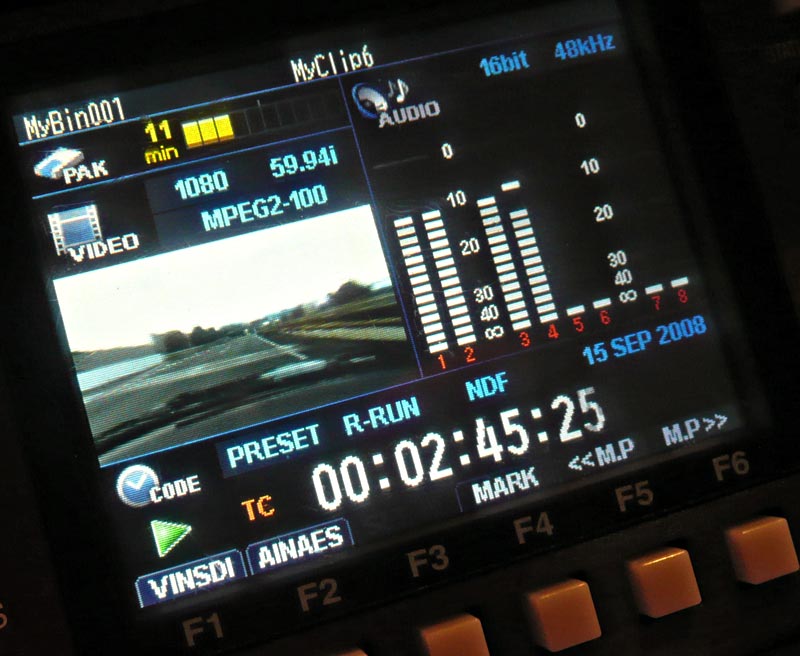 Die Bilder und Töne schreibt der Camcorder als MXF-Files auf die GF-Paks. Für HD-Aufzeichnungen stehen I-Frame-Only mit 100 Mbps oder Long-GoP mit 50 Mbps zur Verfügung. Wenn in SD aufgezeichnet werden soll, stehen hierfür 30, 40 und 50 Mbps als Datenrate zur Verfügung und es werden IMX-kompatible Files in den MXF-Container geschrieben.