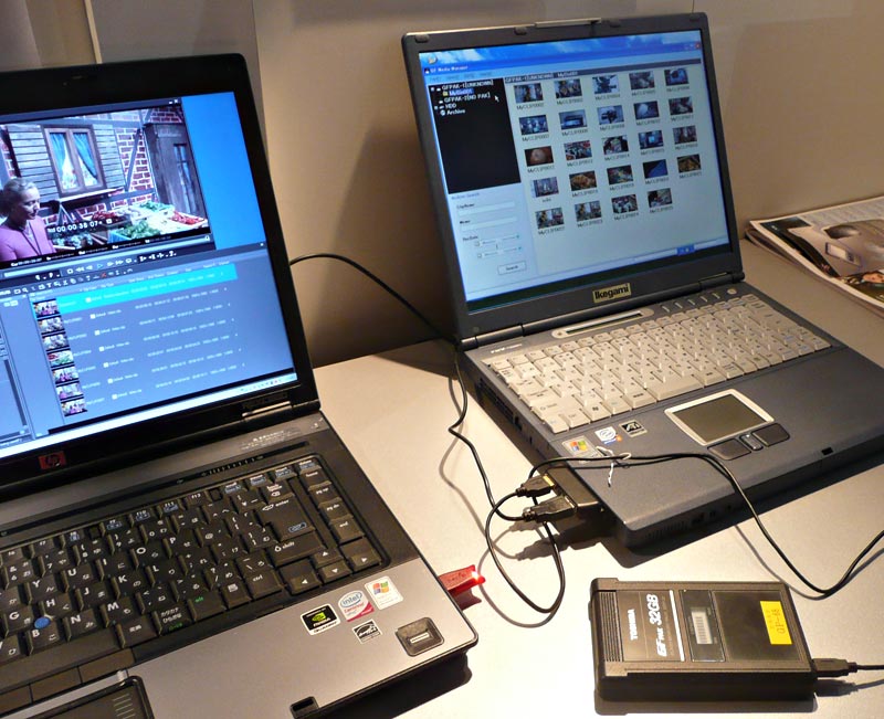 Zunächst sollen GF-Paks mit Speichergrößen von 16, 32 und 64 GB auf den Markt kommen. Auf das 32-GB-Medium passen ungefähr eine Stunde 50-Mbps-Aufnahmen. Intern kann der Speicher laut Firmenangaben zunächst Datenraten bis 200 Mbps schreiben und ausgeben, die Schnittstelle ist gleich leistungsfähiger konzipiert und erreicht demnach 1,5 Gbps (SATA). Für den Anschluss an NLE-Systeme sorgt die zusätzlich vorhandene USB-2.0-Schnittstelle. Die GF-Paks werden vom Rechner wie Laufwerke erkannt und behandelt, man kann das Material sofort schneiden.