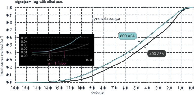 Eine Empfindlichkeit von 800 ASA, die sich elektronisch noch weiter erhöhen lässt und ein Kontrastumfang von derzeit 12 Blendenstufen (gemessen mit dem Arri-Hausstandard) kennzeichnen die hohe Leistungsfähigkeit des Sensors, den Arri in seiner kommenden Baureihe von Digitalkameras einsetzen will. Rein wissenschaftlich (full well/temporal noise) könnte man von 13 Blenden sprechen, wie Dr. Oehler erläutert, in Zukunft könnten mit der von Arri genutzten Sensortechnik eventuell bis zu 14 oder 15 Blenden erreicht werden.