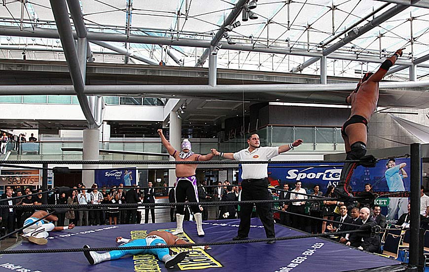 Fighting Spirit: In der Eingangshalle des Veranstaltungszentrums Grimaldi Forum, war am 2. Messetag ein Boxring aufgebaut. Dort präsentierten Athleten verschiedener Kampfsportdisziplinen ihr jeweiliges Metier und warben für die Vermarktung der Kampfsportarten. Vor allem in Südamerika und in Asien sind Wrestling, Kickboxen und verwandte Sportarten populär. Fighting Spirit produziert wöchentlich acht Stunden Wrestling für Televisa in Mexico, Fox Sports in den USA aber auch für Canal+ in Frankreich. Zu den jährlich acht bis zehn Veranstaltungen der World Championships kommen jedes Mal bis zu 20.000 Zuschauer, die neben den Kämpfen auch mit Live-Musik, Showeinlagen und Feuerwerk unterhalten werden. Inspiriert vom Erfolg dieser Kampfshows produziert Fighting Spirit nun auch eine Reality TV Show mit Kickbox-Weltmeistern auf der Insel Koh Samui in Thailand: Eine Mischung aus »Big Brother« und Kampfsport-Wettkämpfen.