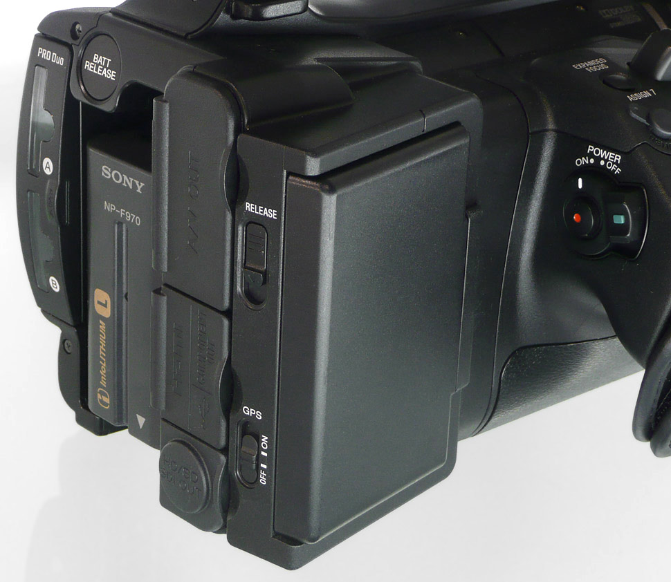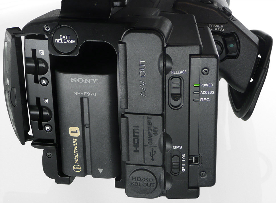 Neben einem Cinch-AV- und einen Komponentenanschluss sowie einer USB-Buchse, ist der Camcorder mit HD-SDI– und mit HDMI-Ausgängen ausgerüstet. Beide Ausgänge lassen sich sogar parallel betreiben. Auf eine S-Video-Buchse hat Sony verzichtet.
